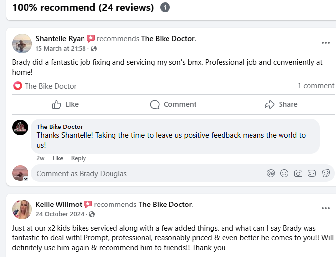 Highly recommend Brady and The Bike Doctor. As a busy working mum it’s so convenient having the bike serviced and repaired at home. Brady was very easy to communicate with, he was prompt and had the bike fixed and ready on the day. I’ll definitely be using The Bike Doctor again and recommending to friends and family.